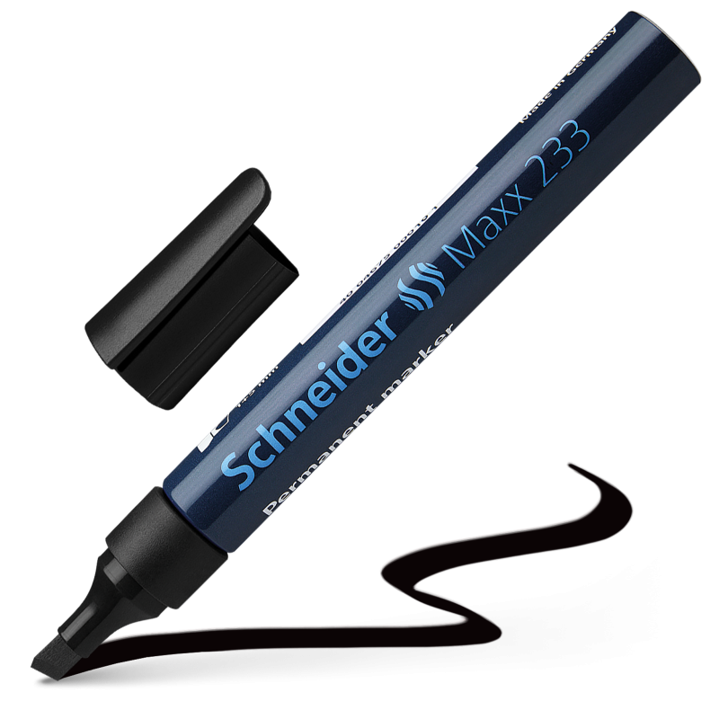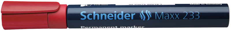 Permanent marker with aluminium barrel and chisel tip, line widths 1+5 mm. Writing colour red. For writing on cardboard, paper, plastic, glass, metal, wood and almost all other materials. The writing is quick-drying, water-proof and highly light resistant. The cap-off ink does not run dry even if the cap is removed for 2-3 days. It has a low odour and is free of toluol and xylol. The marker has a practical clip cap and can be refilled using Maxx 650 refill bottle.